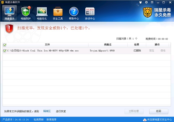 圖2:瑞星殺毒軟件V16+已能徹底查殺偽裝成《白日焰火》的病毒文件