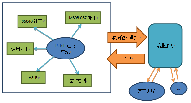 瑞星XP保護(hù)傘熱補(bǔ)丁技術(shù)通過修改存在漏洞的指令代碼流程來檢測(cè)漏洞,當(dāng)檢測(cè)到漏洞攻擊時(shí),通過IPC通知服務(wù)。通過規(guī)避常用的漏洞攻擊點(diǎn)實(shí)現(xiàn)預(yù)防功能,如打開DEP,ASLR,預(yù)分配椎噴射常用的地址來實(shí)現(xiàn)免疫功能。