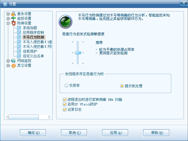 在彈出的設(shè)置程序界面中,切換到“木馬行為防御”設(shè)置頁面,可以看到“啟用 XP VPatch防護(hù)”功能設(shè)置項(xiàng),如圖