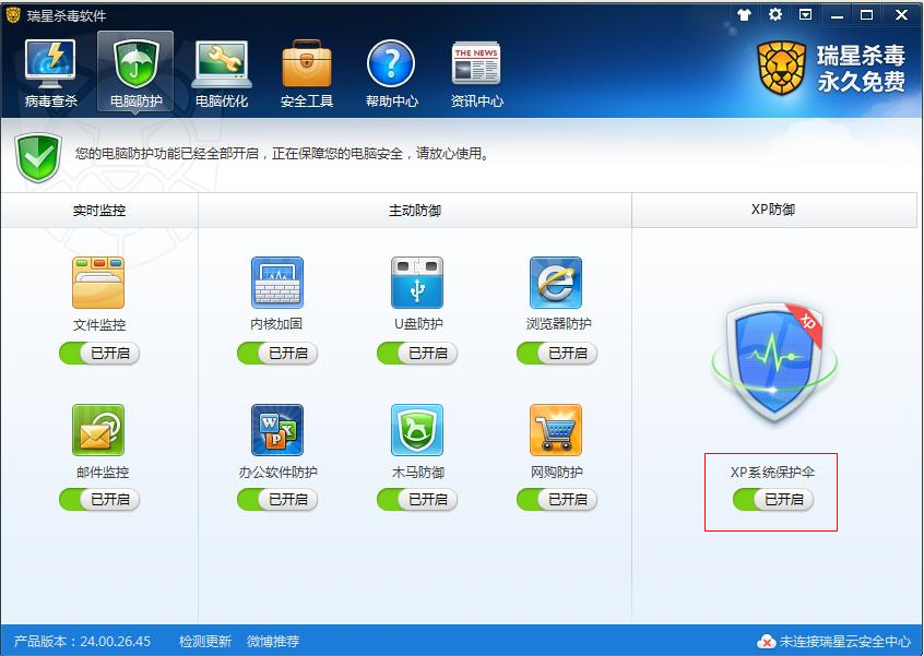 6.使用功能全面的專業(yè)安全軟件,開啟瑞星殺毒軟件的XP系統(tǒng)保護(hù)傘功能。