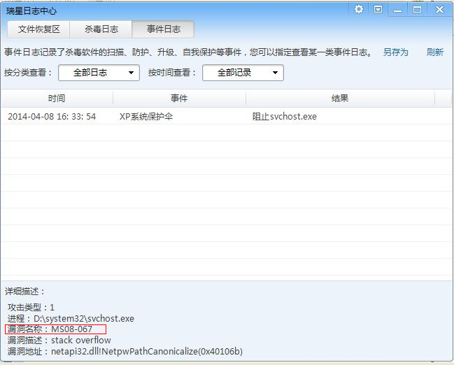 下述為瑞星殺毒軟件XP保護(hù)傘阻擋MS08-067病毒對(duì)沒有安裝微軟補(bǔ)丁的XP系統(tǒng)的保護(hù)。