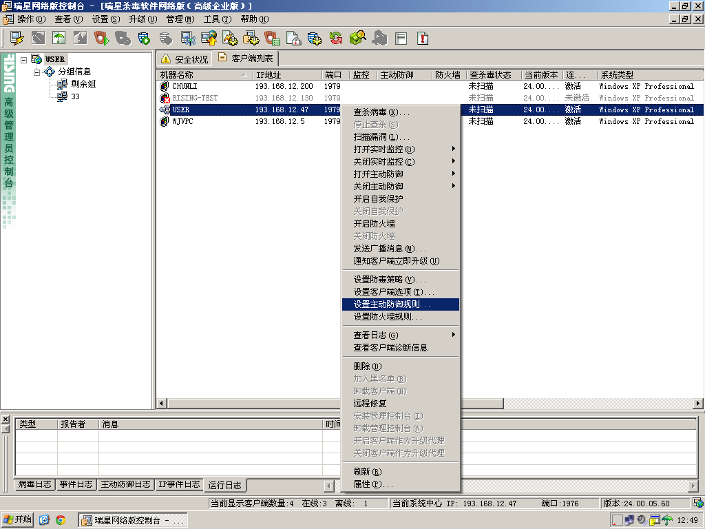 在網(wǎng)絡(luò)版系統(tǒng)中心,打開“管理控制臺(tái)”程序,右鍵選擇需要開啟XP VPatch 功能的組或客戶端,在彈出菜單中,點(diǎn)擊“設(shè)置主動(dòng)防御規(guī)則”,如圖