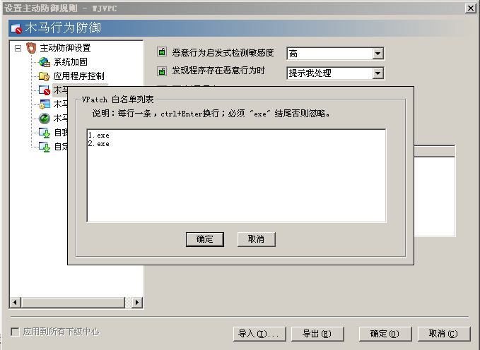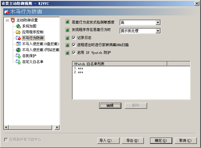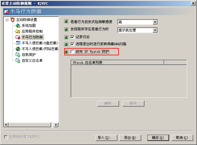 在“設(shè)置主動(dòng)防御規(guī)則”界面,切換到“木馬行為防御”設(shè)置界面,可以看到“啟用 XP VPatch防護(hù)”功能設(shè)置項(xiàng),如圖
