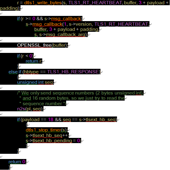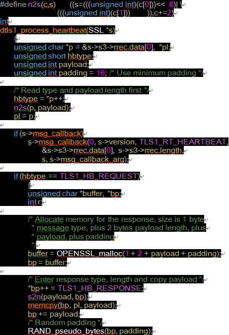 處理過程:從數(shù)據(jù)中讀取長度payload,并根據(jù)數(shù)據(jù)包長度直接申請內(nèi)存,然后拷貝payload 大小的數(shù)據(jù)到申請的內(nèi)存空間;由于沒有驗(yàn)證length是否真是數(shù)據(jù)包的實(shí)際大小,所以如果讓有心人偽造一個(gè)length字段(length字段比實(shí)際數(shù)據(jù)要大),就可以越界訪問內(nèi)存,從而導(dǎo)致內(nèi)存泄漏。