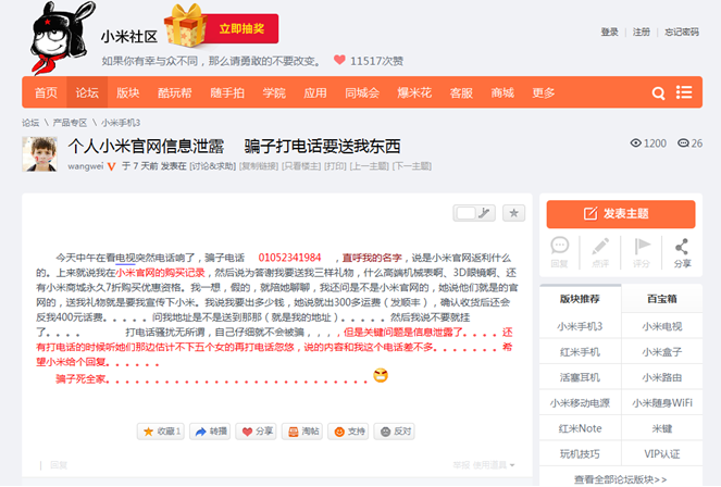 圖1:網(wǎng)友在小米論壇投訴個人信息被泄露遭遇詐騙