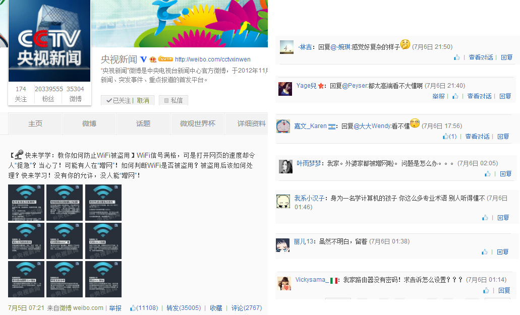 圖1:央視新聞在微博上給出的防蹭網(wǎng)技巧,很多人表示看不懂