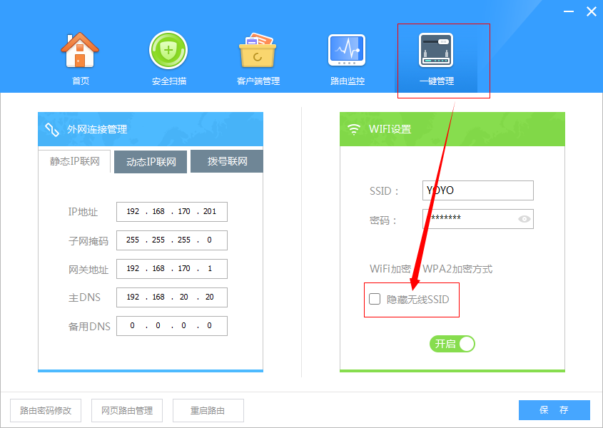 圖10:瑞星路由安全衛(wèi)士的一鍵管理功能里直接可以選擇關(guān)閉SSID