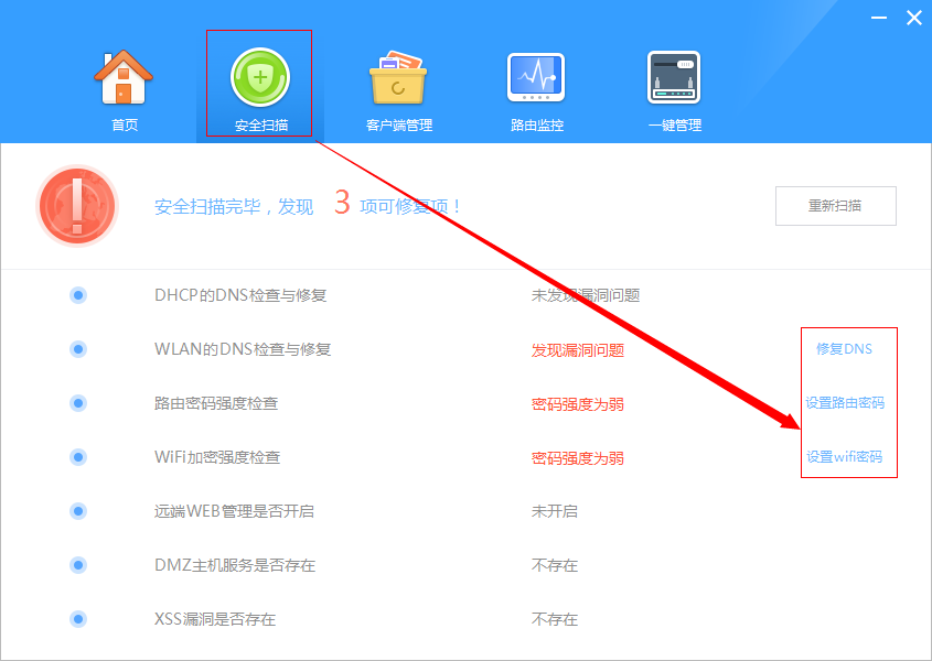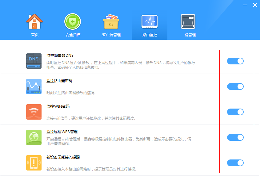 簡單總結(jié)一下,只要安裝了瑞星路由安全衛(wèi)士,除了上述操作以外,做一做安全掃描、自動(dòng)修復(fù)、打開監(jiān)控功能,基本上就可以跟黑客攻擊、無休止的蹭網(wǎng)說再見了。具體的操作方法,只需要按照提示點(diǎn)一下鼠標(biāo)就行了。