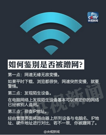圖2:央視微博上關(guān)于鑒別是否被蹭網(wǎng)和查看路由連接設(shè)備的技巧