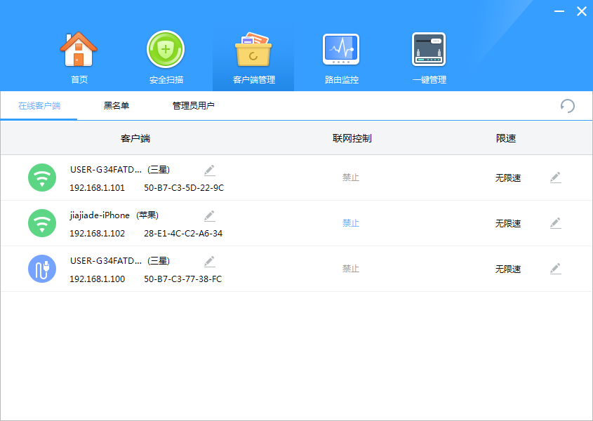 安裝了瑞星路由安全衛(wèi)士后,首先進(jìn)行常規(guī)配置,把路由器的管理賬號(hào)密碼輸入后,點(diǎn)擊“客戶端管理”,然后就可以看到所有已連接的設(shè)備,在這里可以隨意踢出、拉黑、限速。當(dāng)然,只要你開著監(jiān)控,當(dāng)新的設(shè)備連接你的WiFi時(shí),軟件會(huì)自動(dòng)彈出提示,你只需要允許或拒絕就行了。