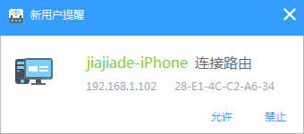 圖4:當(dāng)有新的設(shè)備連接WiFi網(wǎng)絡(luò)時(shí),軟件會(huì)提示,你可以決定是否允許連入