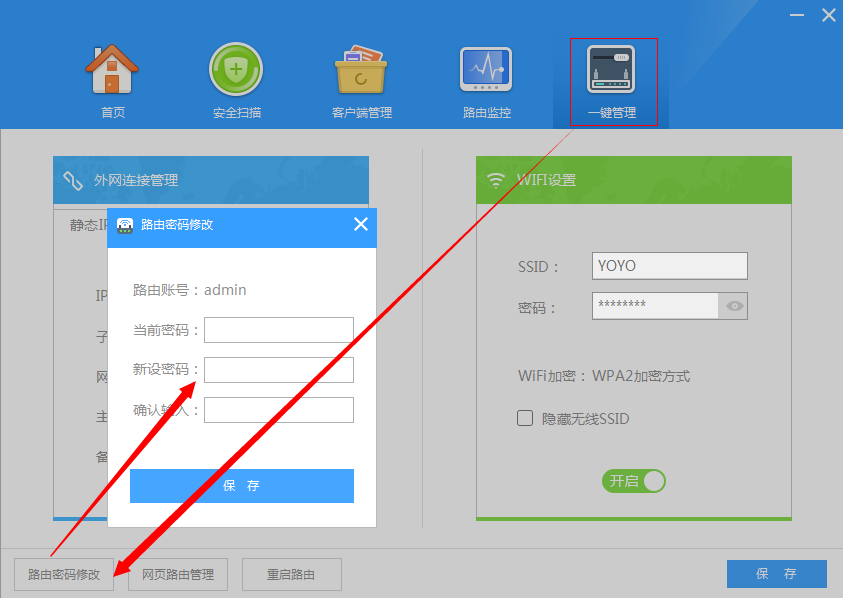 打開瑞星路由安全衛(wèi)士主界面,然后點(diǎn)擊“一鍵管理”——點(diǎn)擊左下角的“路由密碼修改”,然后就可以把全國皆知的admin/admin密碼修改掉了。