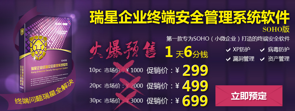 2014-08-21 10:09:08?8月21日,瑞星公司旗下企業(yè)級產(chǎn)品瑞星企業(yè)終端安全管理系統(tǒng)軟件SOHO版(以下簡稱瑞星ESM SOHO版)在京東商城上線預(yù)售。瑞星安全專家表示,現(xiàn)在許多小微企業(yè)和家庭用戶在信息安全方面都存在有需求、無預(yù)算的窘境,本次預(yù)售的瑞星ESM主要是面向該類人群,更加小巧輕便,分為10臺(tái)PC、20臺(tái)PC及30臺(tái)PC三種套餐。現(xiàn)在參加預(yù)定活動(dòng)可以享受2-3折的優(yōu)惠價(jià),平均每臺(tái)PC每天6分錢就可以享受一年的信息安全保護(hù)及專業(yè)級的技術(shù)支持,用戶可在京東商城的活動(dòng)頁面(http://sale.jd.com/act/PLjJemQowF6nR.html)搶先預(yù)購。?