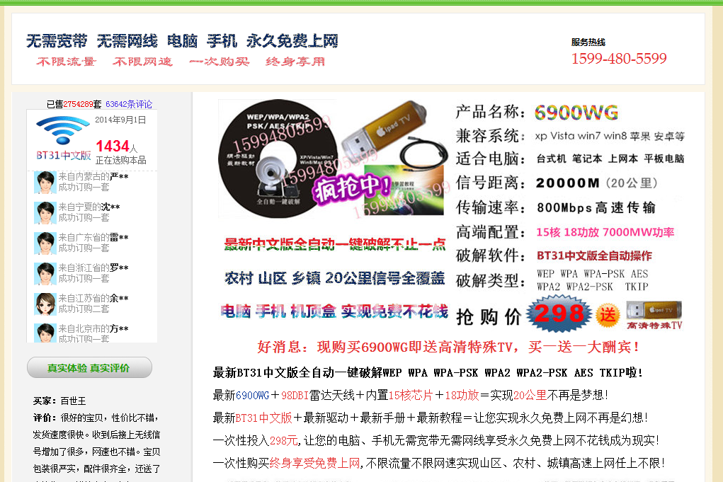 瑞星安全專家指出,蹭網(wǎng)本身就是盜取他人上網(wǎng)賬號(hào)及寬帶資源,屬于不正規(guī)行為。所謂硬件“蹭網(wǎng)神器”實(shí)際上就是一張高功率網(wǎng)卡,正常價(jià)格在100元左右,售賣“蹭網(wǎng)神器”的網(wǎng)站為其配上了一套從網(wǎng)上免費(fèi)下載的黑客破解系統(tǒng)就開(kāi)價(jià)298元,實(shí)屬欺詐。