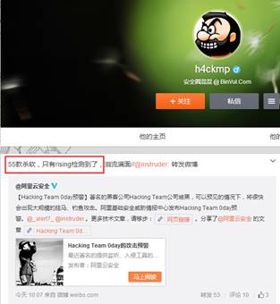 7月8日,安全圈某知名人士進(jìn)行檢測,發(fā)現(xiàn)55款殺毒軟件中,只有瑞星殺毒軟件可以檢測并查殺此次Hacking Team被公開的漏洞。