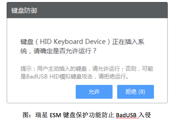 目前,鍵盤保護(hù)功能已集成在瑞星企業(yè)終端安全管理系統(tǒng)軟件(以下簡(jiǎn)稱瑞星ESM)中,用戶只需將瑞星ESM升級(jí)至最新版,即可獲得針對(duì)BadUSB的防護(hù)。