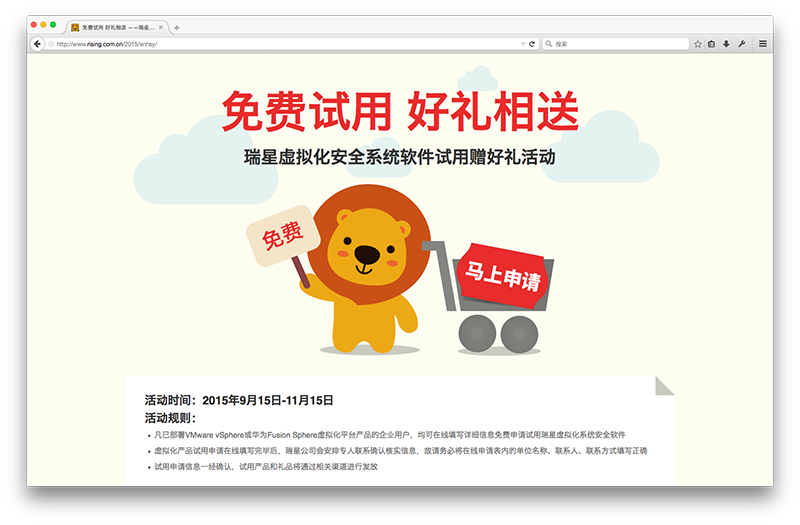 瑞星安全專家介紹,凡已部署VMware vSphere或華為Fusion Sphere虛擬化平臺產(chǎn)品的企業(yè)用戶,均可在線填寫詳細(xì)信息,免費申請試用產(chǎn)品,試用申請信息一經(jīng)確認(rèn),試用產(chǎn)品和禮品將通過相關(guān)渠道進(jìn)行發(fā)放。
