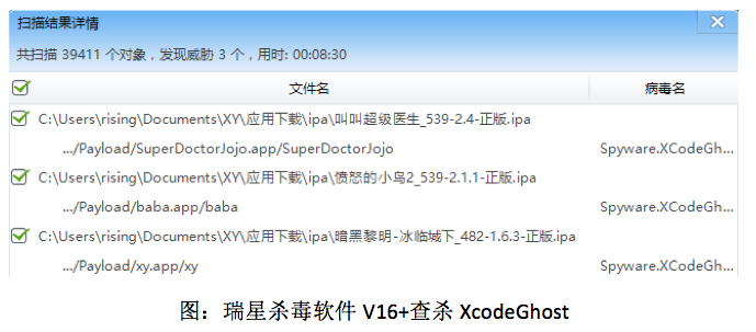 目前,瑞星大數(shù)據(jù)平臺(tái)(地址:http://data.rising.com.cn/index.aspx)和瑞星殺毒軟件V16+(免費(fèi)下載:http://pc.rising.com.cn/V16plus/)均能對(duì)染毒的APP進(jìn)行檢測(cè)。建議所有用戶盡快在電腦中對(duì)APP進(jìn)行備份,并將備份的程序上傳至瑞星大數(shù)據(jù)平臺(tái)檢測(cè),或使用瑞星殺毒軟件V16+進(jìn)行掃描。