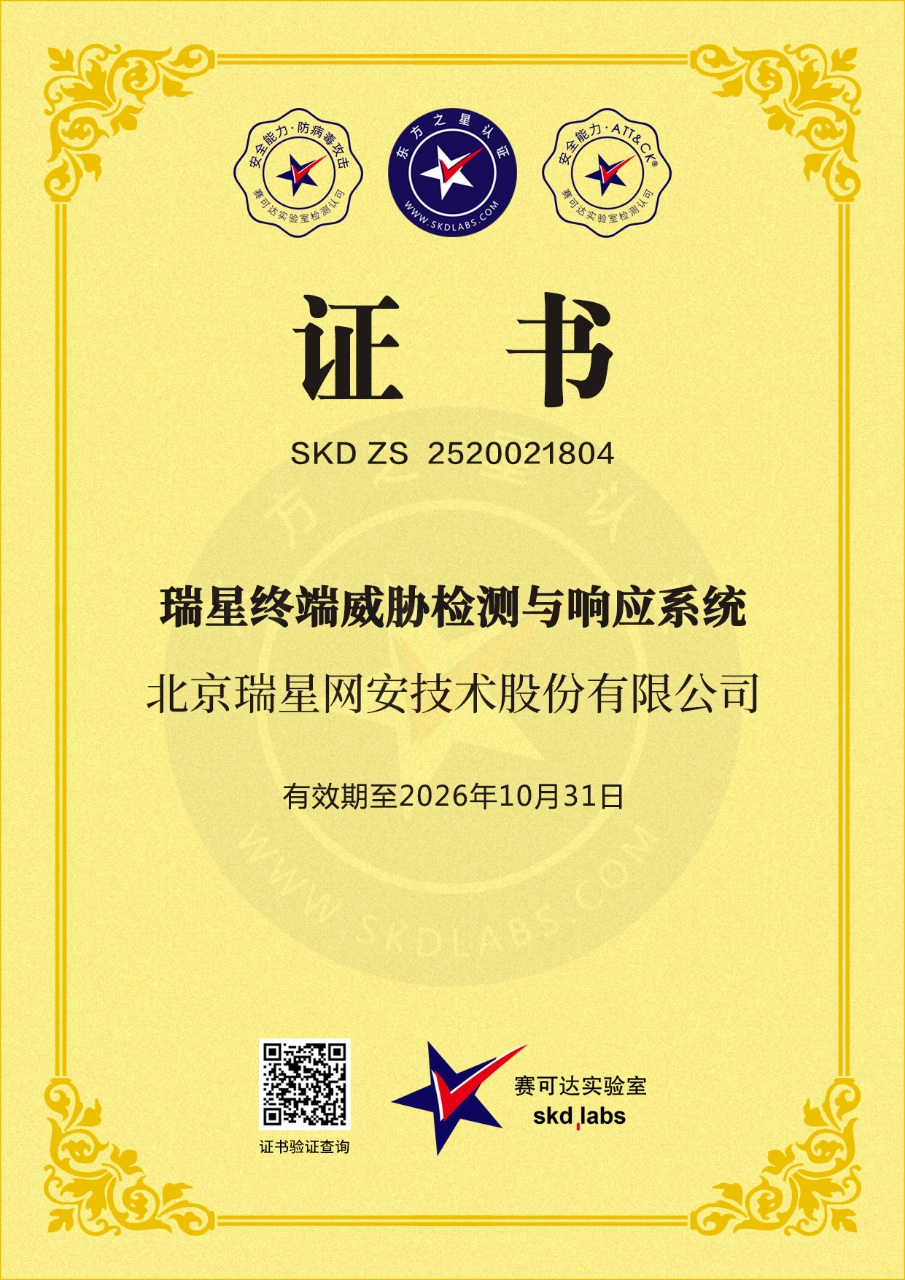 瑞星終端威脅檢測與響應系統(tǒng) 2026-03-11 技術創(chuàng)新獎 2026-03-11 賽可達優(yōu)秀產(chǎn)品獎 2026-03-11 ATT&CK 安全能力獎 2025-11-03 賽可達認證 2025-09-29 高質(zhì)量數(shù)字化轉(zhuǎn)型產(chǎn)品及服務全景圖 2025-02-21 2024年度賽可達ATT&CK安全能力獎 2025-02-21 2024年度賽可達技術創(chuàng)新獎 2025-02-21 2024年度賽可達優(yōu)秀產(chǎn)品獎 2024-09-26 《高質(zhì)量數(shù)字化轉(zhuǎn)型產(chǎn)品及服務全景圖(2024)》 2024-09-23 賽可達認證 2023-12-25 2023高質(zhì)量數(shù)字化轉(zhuǎn)型產(chǎn)品及服務全景圖 2023-11-03 2023網(wǎng)絡安全領域卓越產(chǎn)品