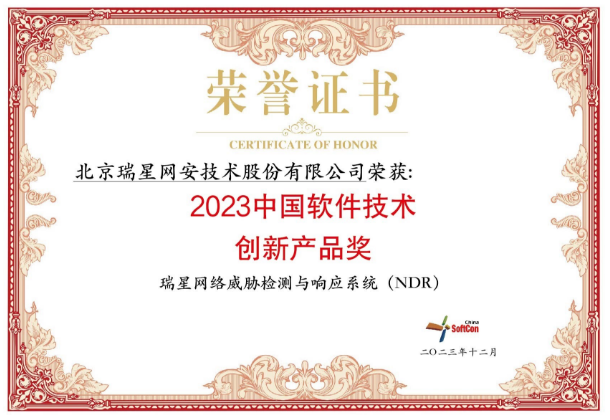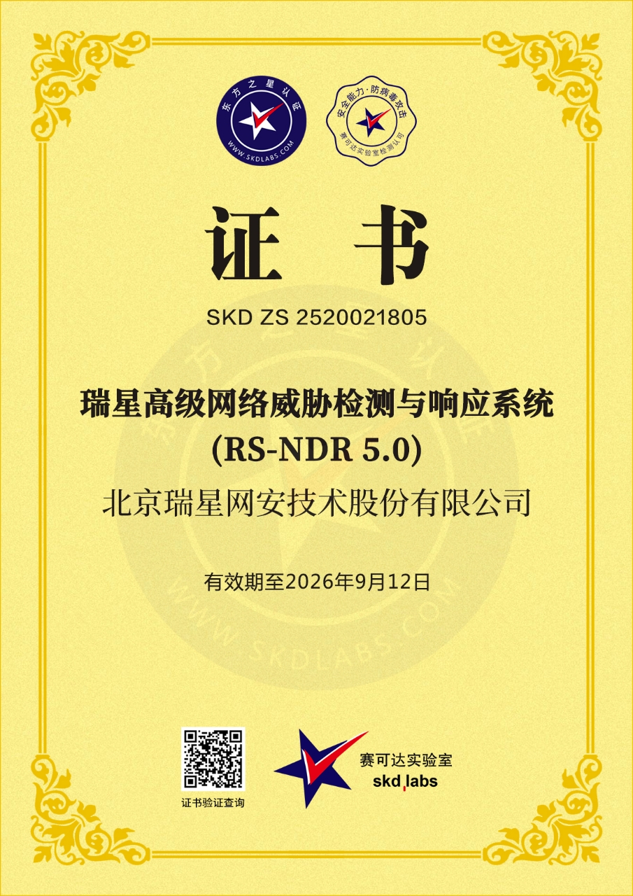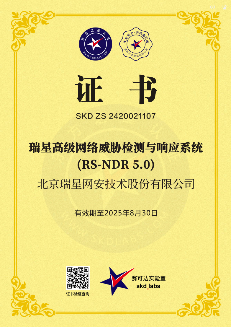 瑞星網(wǎng)絡(luò)威脅檢測與響應(yīng)系統(tǒng) 2025-11-03 賽可達認證 2025-02-21 2024年度賽可達技術(shù)創(chuàng)新獎 2025-02-21 2024年度賽可達優(yōu)秀產(chǎn)品獎 2024-09-23 賽可達認證 2023-12-19 2023中國軟件技術(shù)創(chuàng)新產(chǎn)品獎
