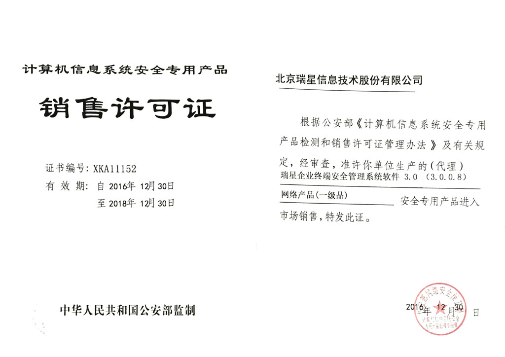 瑞星企業(yè)終端安全管理系統(tǒng)軟件3.0 銷售許可