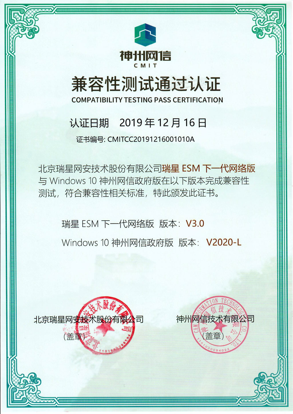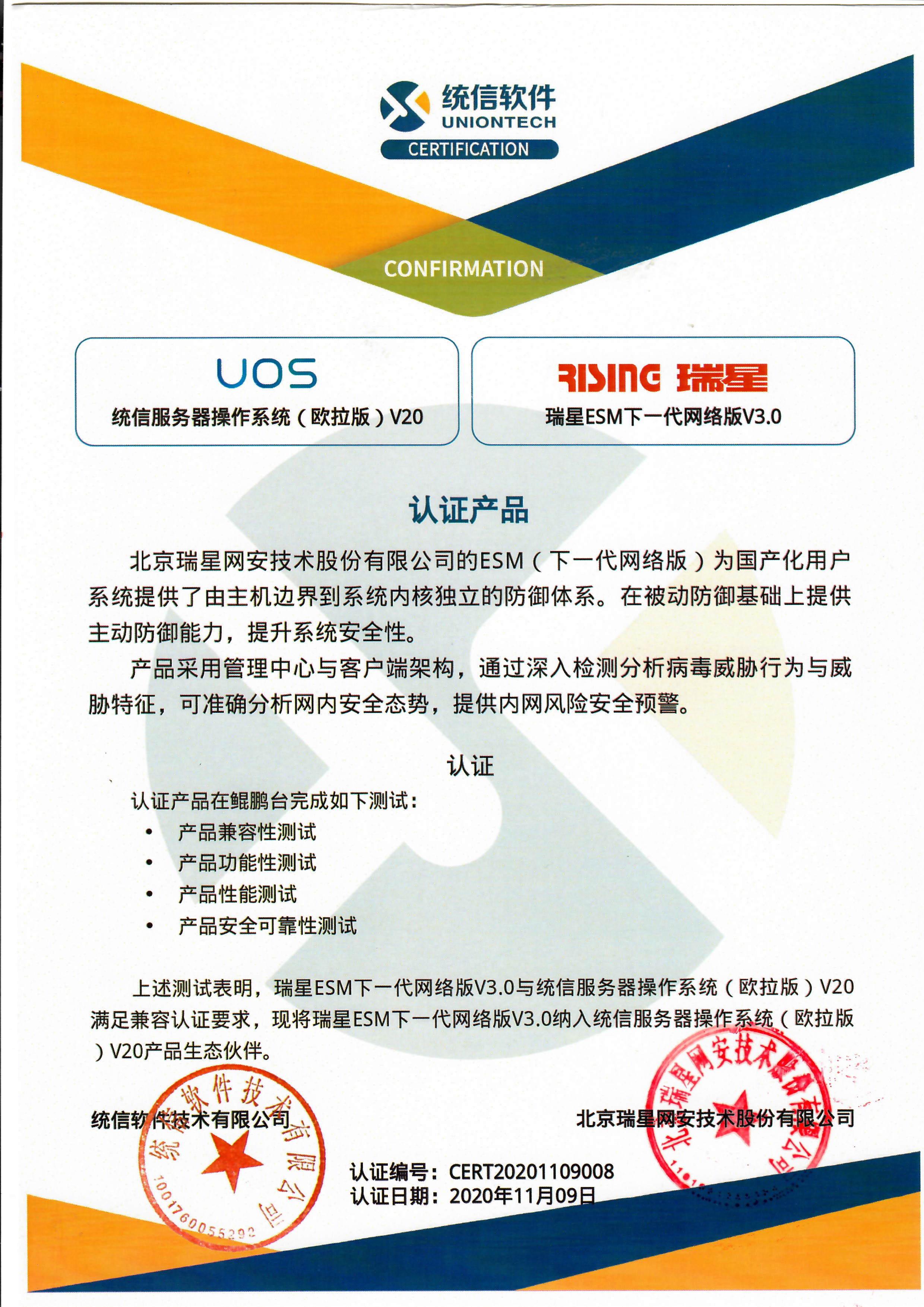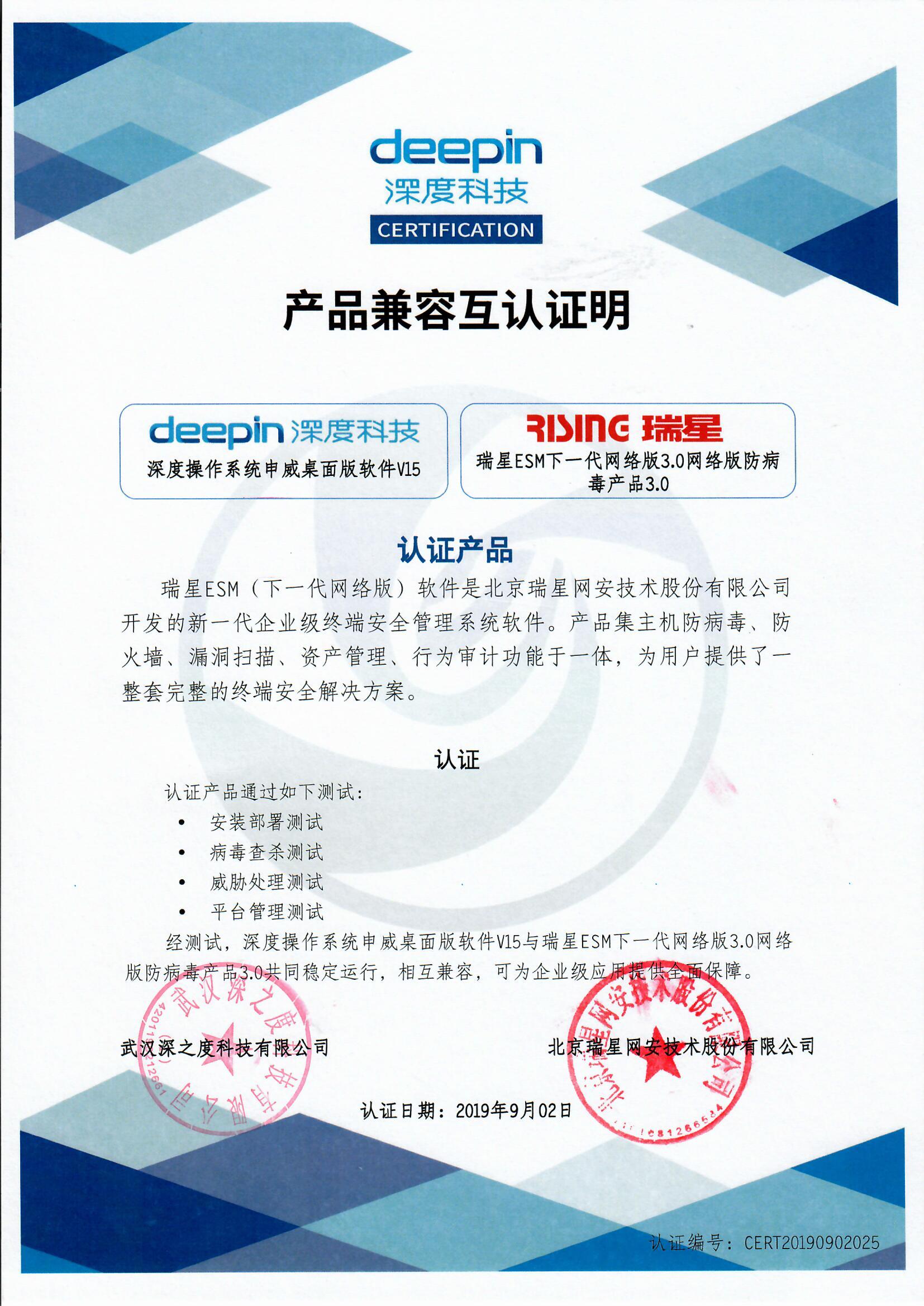瑞星ESM防病毒終端安全防護(hù)系統(tǒng) 2021-12-30 計(jì)算機(jī)軟件著作權(quán)登記證書 2021-06-17 銷售許可證 2021-05-07 賽可達(dá)認(rèn)證 2021-01-29 2020年度賽可達(dá)優(yōu)秀產(chǎn)品獎(jiǎng) 2020-12-08 統(tǒng)信服務(wù)器操作系統(tǒng)(歐拉版)V20 2020-09-30 信息技術(shù)應(yīng)用創(chuàng)新優(yōu)秀應(yīng)用軟件 2020-09-27 兼容性測試通過認(rèn)證 Windows 10神州網(wǎng)信政府版 2020-01-15 2019年度賽可達(dá)優(yōu)秀產(chǎn)品獎(jiǎng) 2019-12-11 產(chǎn)品兼容互認(rèn)證明 兆芯 2019-10-16 華為技術(shù)認(rèn)證書 OceanStor 9000 V5 2019-09-06 產(chǎn)品兼容互認(rèn)證明 深度操作系統(tǒng)申威桌面版軟件V15 2019-09-06 產(chǎn)品兼容互認(rèn)證明 深度操作系統(tǒng)ARM桌面版軟件V15 首頁 上一頁 1 2 3 4 5 下一頁 尾頁