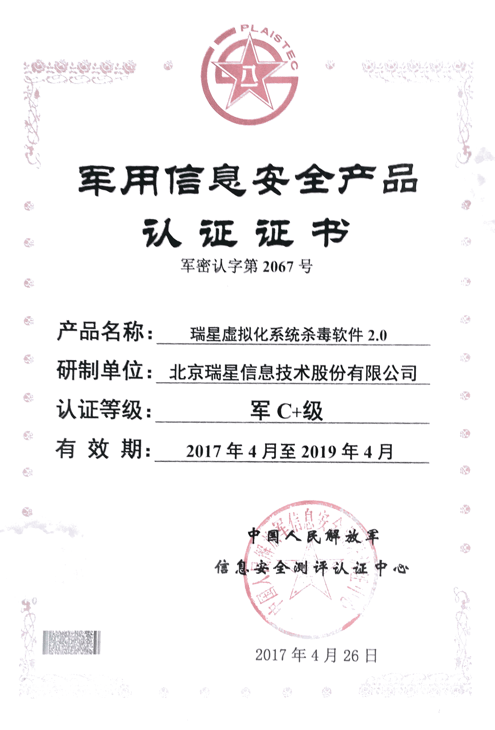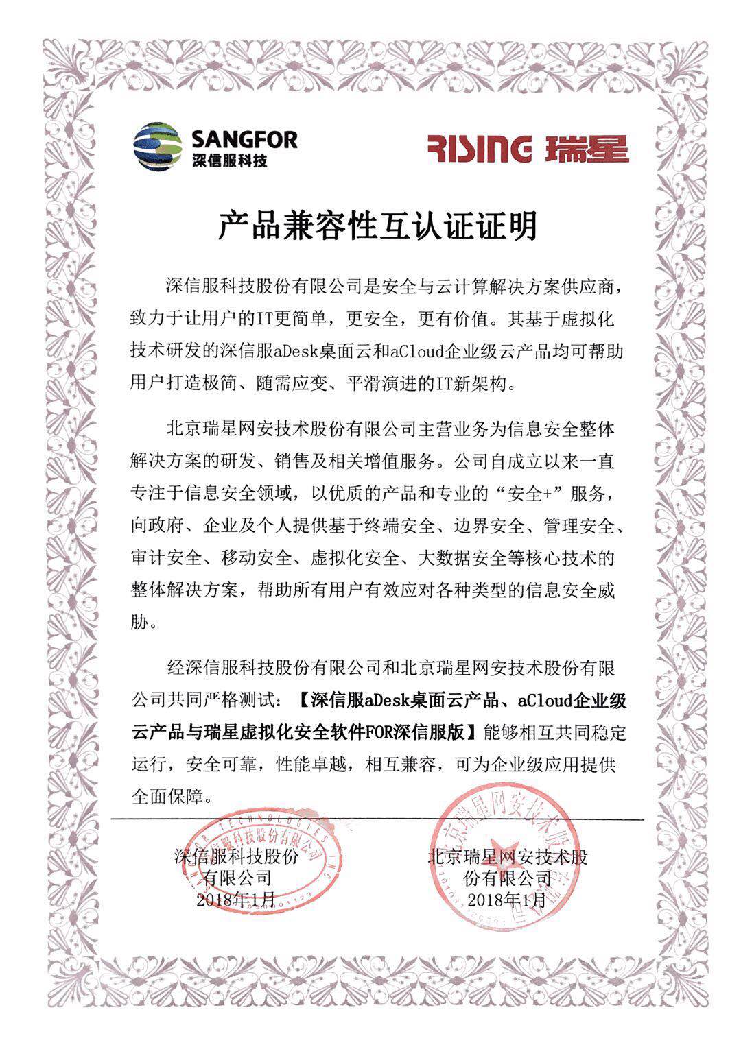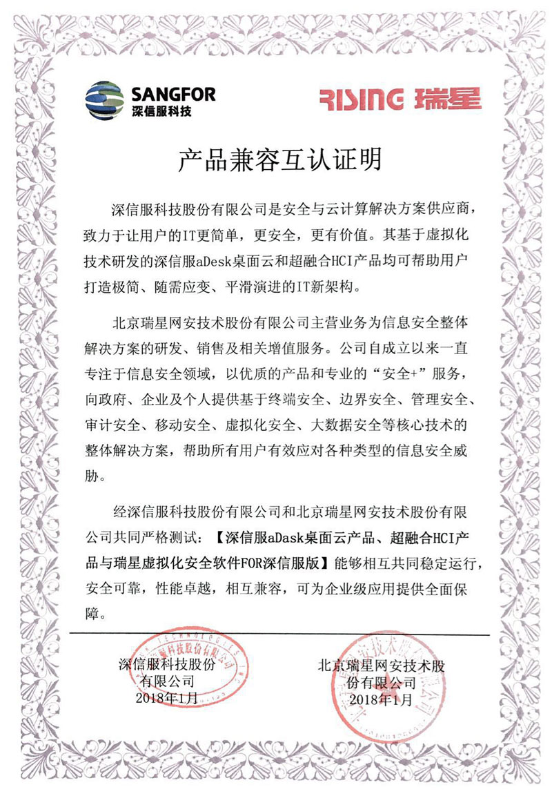 瑞星虛擬化惡意代碼防護系統(tǒng) 2018-02-27 InCloud Lab產品認證證書 2018-02-09 深信服產品兼容性互認證證明 2018-01-18 賽可達優(yōu)秀產品特別獎 2018-01-18 賽可達2017年度優(yōu)秀產品獎 2018-01-08 深信服產品兼容互認證明 2017-12-18 VMware Ready認證 2017-11-28 華為技術認證書 2017-10-30 2017軍工信息安全護航先鋒獎 2017-05-31 軍用信息安全產品認證證書 2017-05-05 2017年度中國互聯(lián)網+行業(yè)最佳產品獎 2017-04-19 賽可達實驗室東方之星安全認證 2016-01-25 賽可達實驗室2015年度優(yōu)秀產品獎 首頁 上一頁 1 2 3 4 下一頁 尾頁