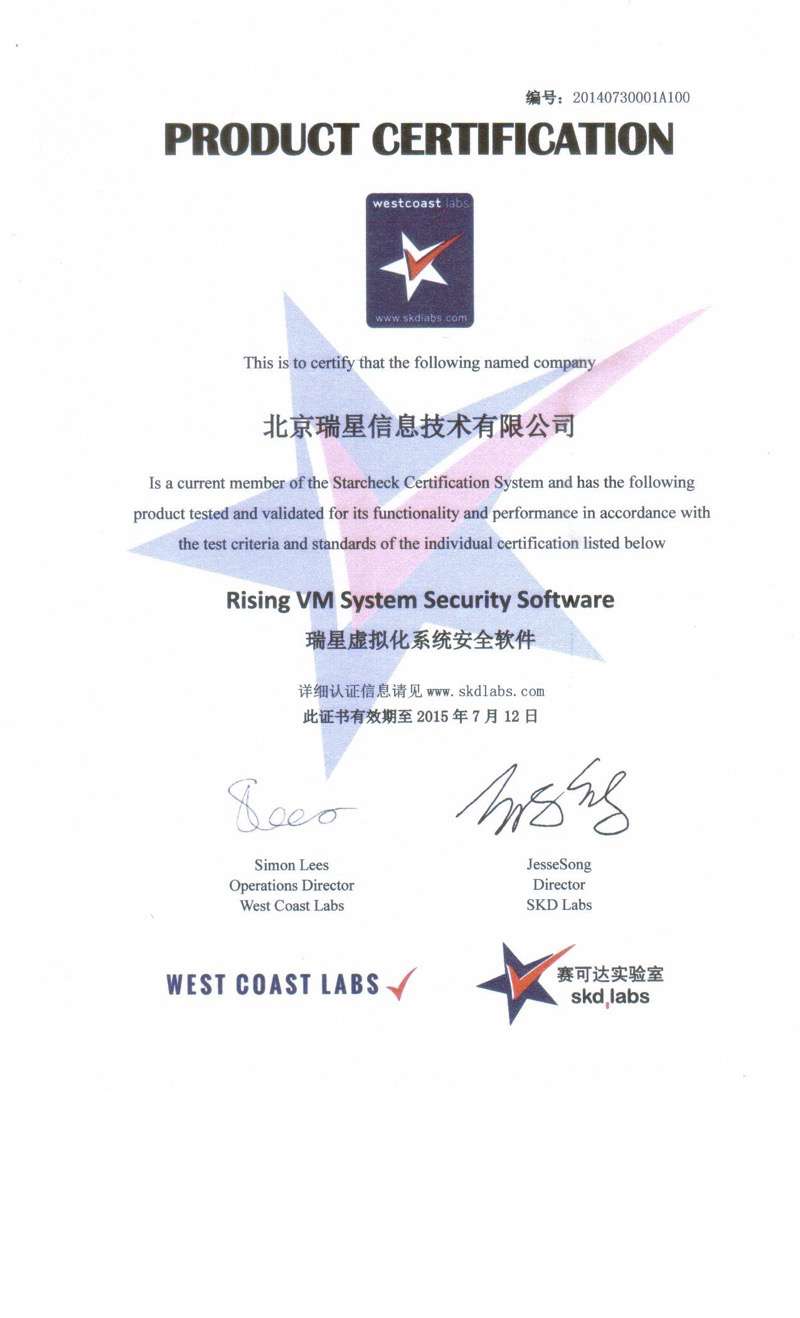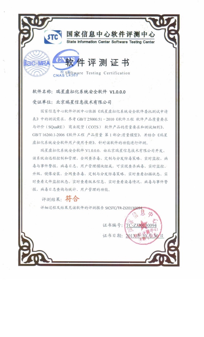 瑞星虛擬化惡意代碼防護(hù)系統(tǒng) 2016-01-18 中國(guó)能源企業(yè)信息化產(chǎn)品技術(shù)創(chuàng)新獎(jiǎng) 2015-11-02 瑞星虛擬化系統(tǒng)安全軟件 賽可達(dá)實(shí)驗(yàn)室認(rèn)證 2015-08-13 瑞星虛擬化系統(tǒng)安全軟件 賽可達(dá)實(shí)驗(yàn)室認(rèn)證 2015-07-29 虛擬化著作權(quán)證書 2015-07-29 虛擬化-賽可達(dá)產(chǎn)品技術(shù)創(chuàng)新獎(jiǎng) 2015-07-29 虛擬化軟件評(píng)測(cè)證書 2015-07-29 虛擬化軟件測(cè)試報(bào)告 2015-07-29 瑞星虛擬化系統(tǒng)安全軟件 銷售許可證 2015-07-29 瑞星虛擬化系統(tǒng)安全軟件 西海岸優(yōu)秀產(chǎn)品獎(jiǎng) 首頁(yè) 上一頁(yè) 2 3 4